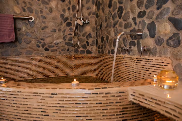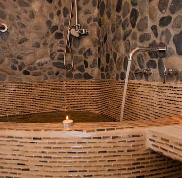 When I arrived there, Nicholas, the owner, explained the procedure and I was able to practice with the window open for light. The room is circular, about eight paces across with two alcoves, one for the bed and one for the bathroom. The bathroom has a great hottub. You have to walk around with your arms up, so that you don’t bang into the wall and hurt yourself. Breakfast and dinner are served. The server rings a bell when the food arrives. I had a little bell that I had to ring. This was just to let them know that I was OK. You know when it is morning because you can faintly hear the birds, likewise at night everything is quiet.