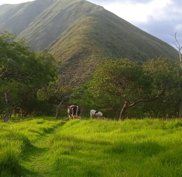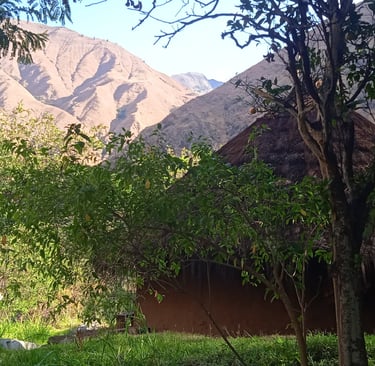 La tierra —3,75 hectáreas (9 acres)— está ubicada en las montañas del sur de Ecuador. Es hermosa y algo aislada. Nos encontramos en un valle, limitado por el río Piscobamba y, a nuestras espaldas, la montaña sagrada Kuntur Wachana, designada como sitio sagrado ancestral por los Kogi del norte de Colombia.